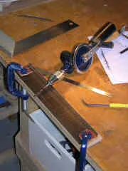 Here a pre-cut and inlaid fingerboard, which is not rectangular, has been set up in a jig, to allow fret slots to be cut at exact right angles to the centre-line. |