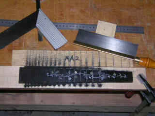 Fret slots are carefully scribed and cut whilst the blank is still rectangular, and any inlay indents are made. |
