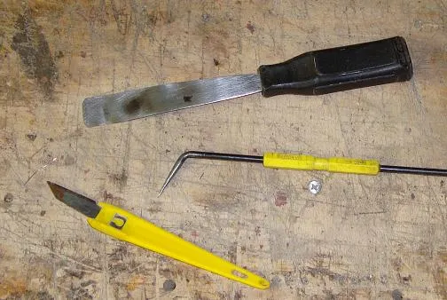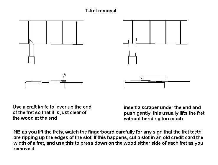 | These are my basic tools for fret removal. A sharp point which helps get in under the end of bar frets; a craft knife which does a similar job fro T-frets; and an old scraper to push under the fret. | T-frets tend to sit more tightly. Early brass one had very little or no teeth, but most DO so go carefully. | |