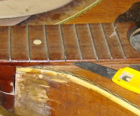 | As can be seen in this photo, bar frets often protrude out of the ends of the slot, as the wood has shrunk, which makes removal easy. | Insert the craft knife under the edge at one side and then the other, firmly turning the edge of the blade upwards. This may take several attempts.... | |