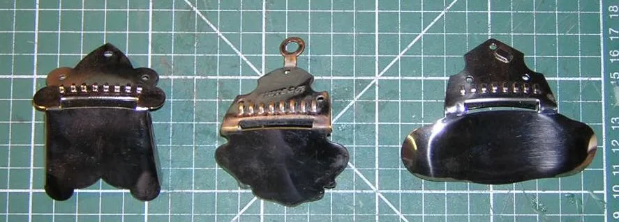 | One of the simplest jobs in the restoration process, is the cleaning of the metal tuners and tailpiece. The photo shows tuners from the same instrument, before and after cleaning. The tail pieces are from different instruments, though very similar. I generally begin with a wire brush, and progress to fine Dremel brushes for polishing. I free up jammed tuners with WD40 and often apply a little '3 in 1' bicycle oil. Wisdom has it, that oil or grease collects dust which is not good for tuners, but I have found it less of a problem than rust! | |||