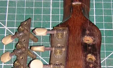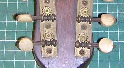 | Side tuners, unfortunately, can have either left-hand or right-hand threads. Below are examples of both. It may have been that originally the right hand threaded tuners were for left-handed players, but I have found them on numerous right-hand strung instruments, with only one set of holes.. | |||