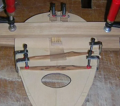 | Here the lower 2 struts are being glued. They force the top to bend, and therefore bring the tail pieces together. I also used a crack clamp to help bring the tail together, and the caul to try and ensure the join was flat, not angled. | Unfortunately, because I did not clamp the centre of the strut, the top lifted a little here. | I needed to remove it and reglue, maintaining a caul on the tail to keep the join flat. |