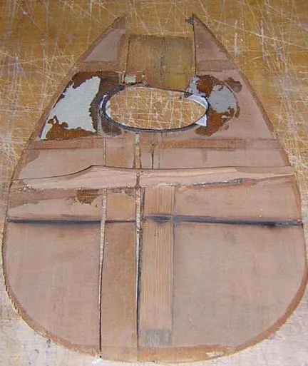 | Here is what was left of the struts in situ. The others were rattling around inside the instrument, but the locations are clearly visible. | All struts were removed and cleaned, and their locations transfered carefully on to the card template. | Here are the old struts lined up on the new top ready for gluing. |
