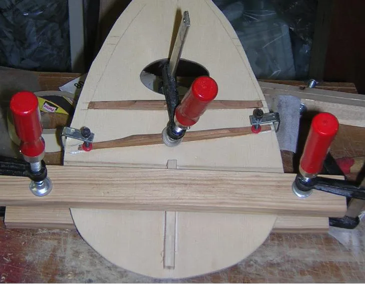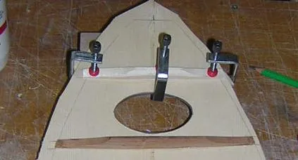 Fitting struts and gluing the tail I decided that it was necessary to link the gluing of struts to the gluing-up of the tail, as the two tail sides only came together after the lowwer two struts were attached. It also proved quite difficult to glue and clamp both the tail and the struts at the same time. I had to work out very carefully what was needed and how to do it. As will be seen shortly, I did not get it all right first time. Never mind! |