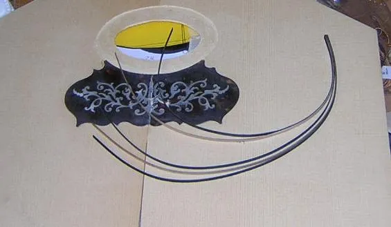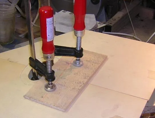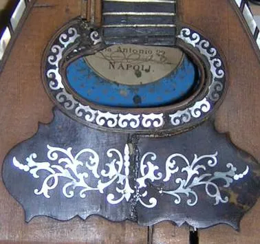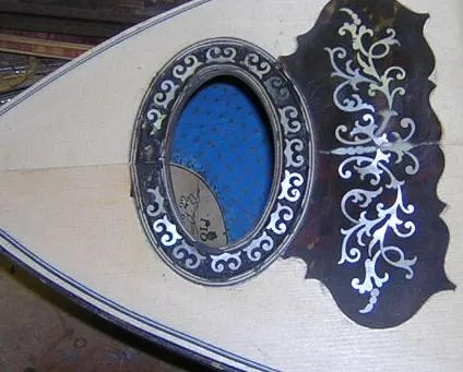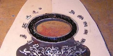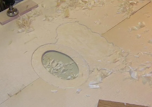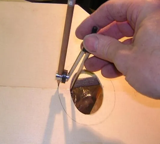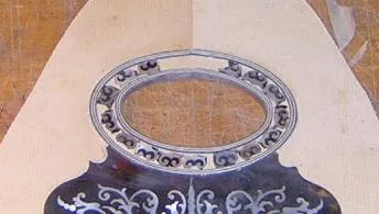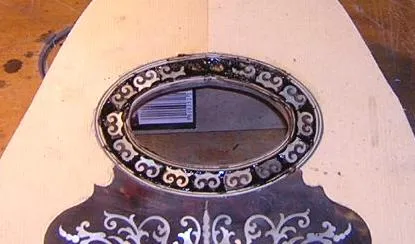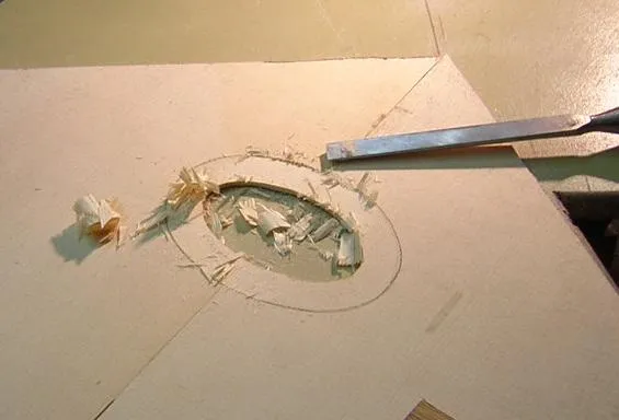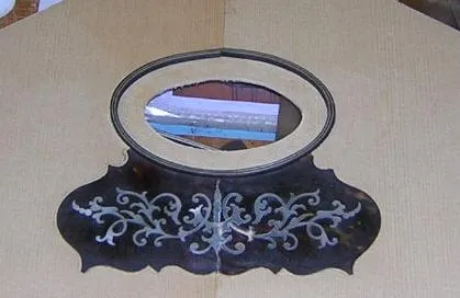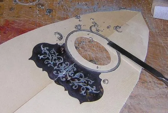 | Here is the original, with all it's damage visible. | Having located the sound hole from the back, it was necessary to mark out the rebate for the surround first, in order to locate the scratchplate rebate. | Here the sound hole inlay rebate is partly chiselled out. I guess I could have used a router, but they tend to have a mind of their own for these intricate jobs. |