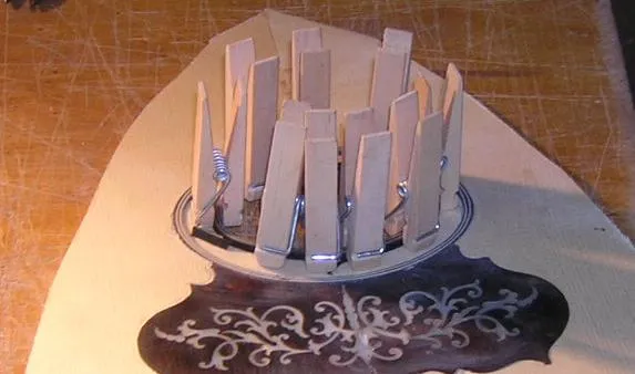 | In order to glue in the sound hole inlay, I needed to create the sides first. Unfortunately the BWB purfling does not react well to being bent so tightly, and it was necessary to re-glue and trial-fit after bending, before gluing in place. | Here it has been glued in, but trying to get an exact fit remotely as it were was not easy. Another time I think I will glue in each strand separately. | The inside section was easier, and was done a strand at a time, each layer after the first being held tightly in place by peg clamps. |