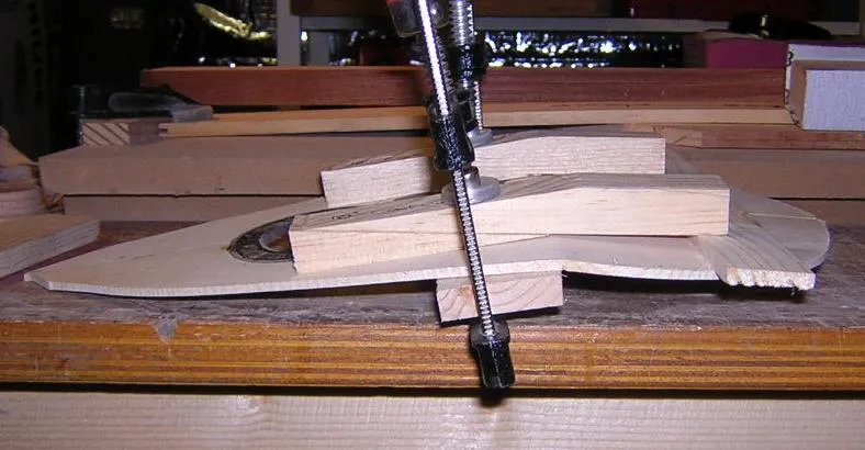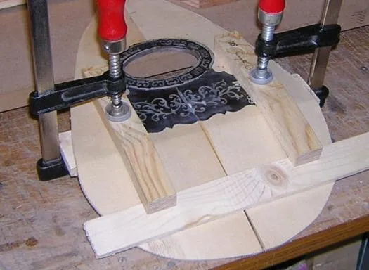 | The warm bent top was clamped into pre-prepared forms to achieve the correct angle of bend for the top. | The cross piece was a necessary addition as once clamped, it became evident the two sides of the tail would not stay level without some extra support. Next time I will clamp them top and bottom with clamps. | 4 small screw holes allowed me to adapt the bending iron for straight line bending. |