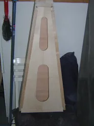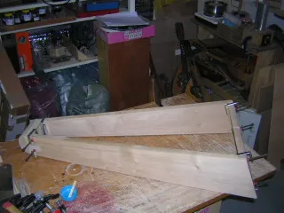 Once the pieces were cut, planed and sanded to some extent, I approached the problem of assembling them. When building mandolins, I use a form to hold the pieces together to achieve the correct orientation, at least to start with. In the plans there was nothing about this type of approach, so I was forced to fall back on clamps and elastic largely. |