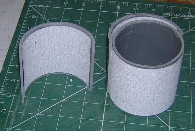 After several abortive efforts to sand them 'together', I finally hit upon the idea of curved sanders. I found a piece of drain pipe that was exactly the radius that I needed. Helpfully, at the end of a section of drain, a pipe widens, so the next section can fit into it. I uses the wider end to fit the sandpaper inside, and the narrower end for outer paper. In this way, in theory, I could sand 2 matching curves. |