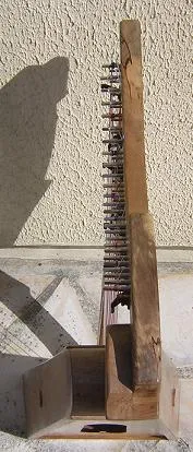 Once stained and assembled, it looked like a harp at last. The foot of the pillar is held in place by a screw from underneath, but the top arm, is held solely on the box top by string pressure. Thats the next bit...........