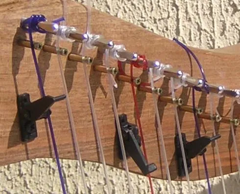 The coloured strings marking the positions of the F and C strings, facilitate navigation amongst the strings whilst playing. Once installed, it took a couple of weeks tuning regularly before the strings settled down and stayed in tune. It was only when this happened that it was possible to install the levers. To finish it was only necessary to trim off the string ends. |