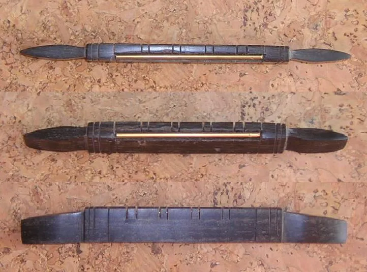 This is a hand-made replacement bridge in ebony and brass, inlaid with MOP, to fit old bowlback mandolins. It can also be fitted with a bone saddle if required. It was copied from an existing bridge on a de Meglio bowlback.