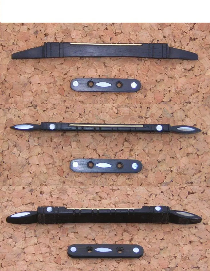This is a hand-made replacement inlaid bridge and tensioner, in ebony or rosewood, with brass saddle, and inlaid with mother of pearl. It is designed to fit old bowlback Neapolitan mandolins, and is based on an existing bridge on a Marazini bowlback. It is 140mm long, 15-18mm tall before fitting, and 5-6mm wide. The brass saddle is approximately 50-55mm long and so would be ideal for wider fingerboards. It will suit required bridge heights of 6-10mm. depending on the curve of the top. Tensioner is approximately 52mm long, 10mm wide and 4mm thick. Screw holes can be drilled and countersunk to customers instructions, normally 20-25mm centre to centre. It will need to be fitted, but comes with a slightly curved foot, to begin fitting to the domed Neapolitan top. The bridge can be supplied without the tensioner if required.