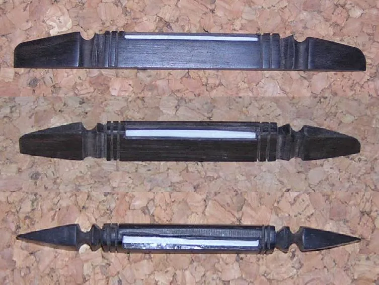 This is a hand-made replacement bridge in ebony or rosewood and bone, to fit old bowlback It can also be fitted with a brass saddle, as in the original. Neapolitan mandolins, and is based on an existing bridge on an Minieri bowlback. It is 125mm long, 12-15mm tall before fitting, and 7-8mm wide at the base and 6mm at the top. The bone saddle is approximately 45mm long. It will suit required bridge heights of 4-10mm depending on the curvature of the top. It will need to be fitted, but comes with a slightly curved foot, to begin fitting to the domed Neapolitan top. String slots can be cut if requested, but I will need to know required spread of strings. |