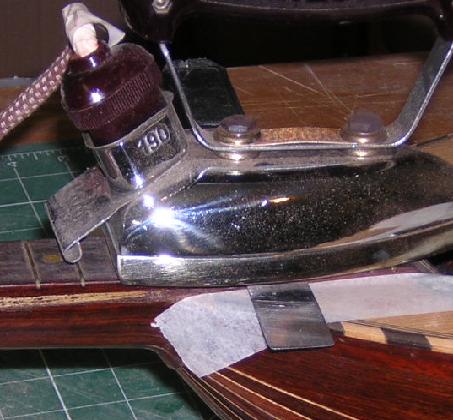 | Many problems with the neck and fingerboard (warping, bowing, damage and re-seating) can only be resolved after the removal of the fingerboard. | When glued on with hide glue, removal is possible with the aid of a spatula, though I have found this is made much easier after warming the old glue. | I achieve this with a small old travel iron, both laid on the board and on the knife blade. |