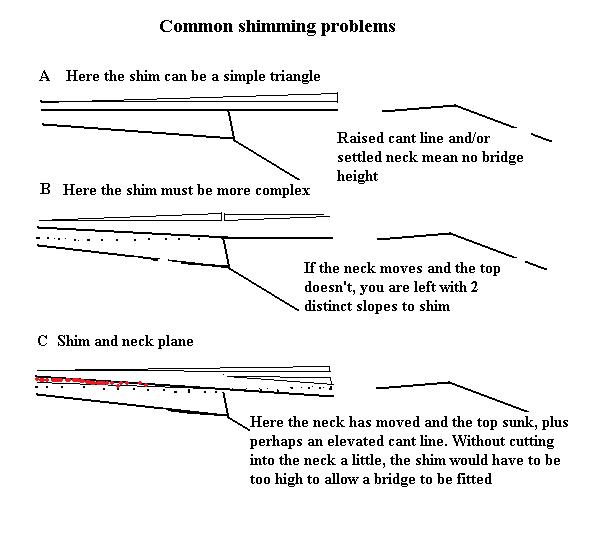 | The reason for fitting a shim, is to raise the level of the board, particularly the bridge end, to give us a better bridge height. It is often the preferable alternative to completely re-setting the neck.... not easy on a bowl back. There are various problems that must be considered when doing this............... | ||