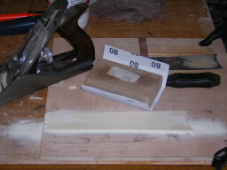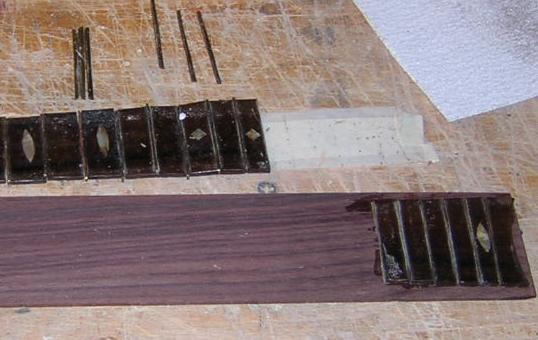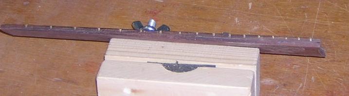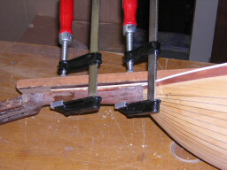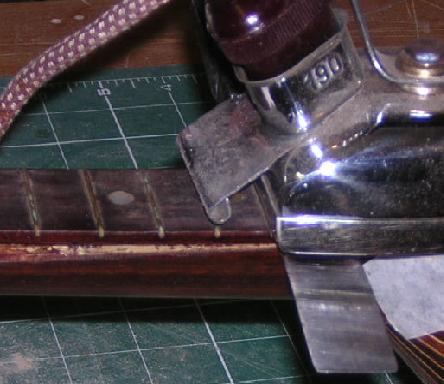 is possible to keep the fingerboard top flat and level. Here a rosewood 'shim' is being glued to a rosewood