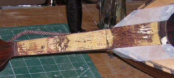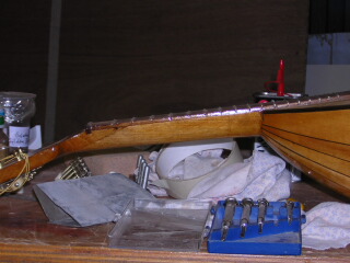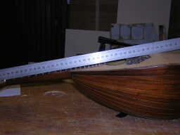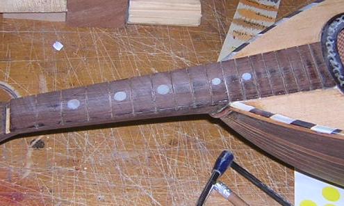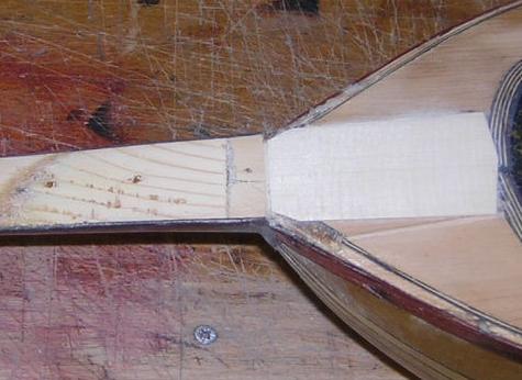 | NB. It doesn't make any difference if you glue the shim to the fingerboard or the mandolin, once the fingerboard is re-glued it is very likely that you will have to either level the frets, or even re-level the board. This is especially the case with Italian instruments, as I am led to suppose that they were glued in place first, and then levelled, thus evening out any inconsistencies in the neck mounting. Fret slots would then be cut and frets fitted. This would explain why there are often cuts in the neck when the f/b is removed, and why the f/b is often not of a uniform thickness. | ||