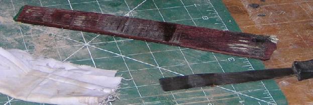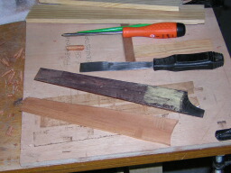 | In order to bring the instrument back to playability, a 'shim' needs to be fitted beneath the fingerboard to even out any dip and raise the sound-hole end, allowing some room for the fitting of a bridge. Often both ends of the 'shim' will need to be carefully tapered before gluing. | Another problem especially with Italian finger boards, is that they are often not of a uniform thickness. This one is about 3mm at the nut but only 2mm at fret 10. | The material depends on that used to make the neck, here a mahogany 'shim' is being made to fit a mahogany neck, but I make from maple, ebony and rosewood. |