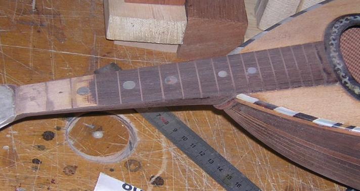 There are a variety of problems that require the removal or adaption of the fingerboard. The commonest cause is settlement of the neck join or warping of the top, that causes a dip around fret 10. This makes a low playing action impossible, and the instrument is practically unplayable. The ideal height of strings above the frets is 2mm or less at fret 12. This common problem can be remedied in several ways......