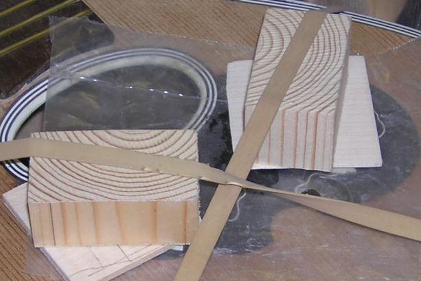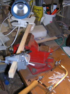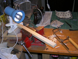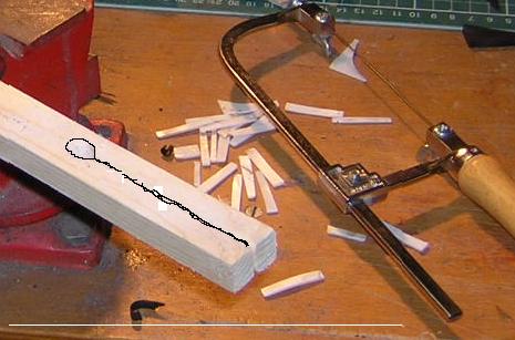New pieces need to be cut and glued in. To do this I have a set up for cutting these small lozenges. For delicate work I use the set up left, enabling me to hold the piece in place over the hole, while cutting using vertical strokes of the Xacto-saw. For less delicate work such as cutting lozenges, the centre set-up is sufficient.