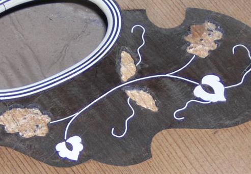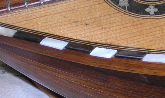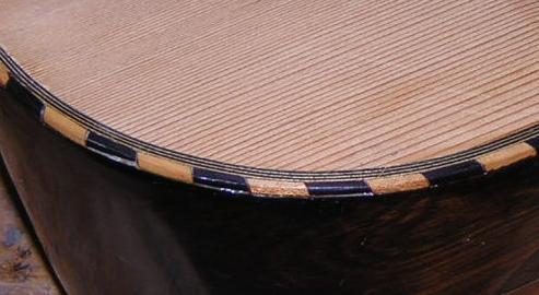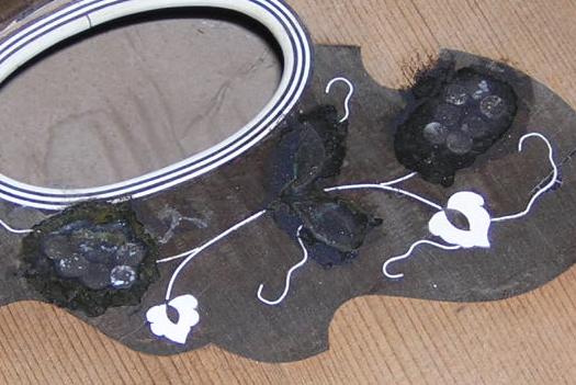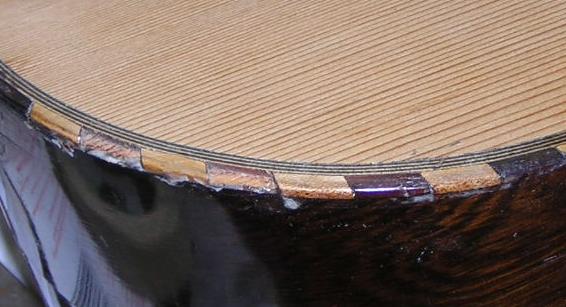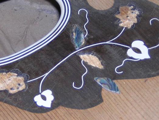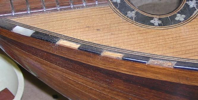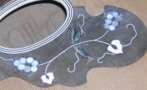 These instruments display typical problems of missing edging, in one case MOP and the other rosewood, but it could easily have been ebony or maple. Most of the wood used is off-cut wood, but the MOP is salvaged and quite thick, so suitable for edging. Most of the MOP and abalone you can buy from luthier suppliers is far too thin for edging pieces. |