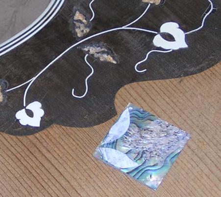 | I decided to do the leaves in abalone, so made small patterns by gluing a little paper over the hole, rubbing over with a pencil, cutting out the outlines, and sticking to the abalone. | The abalone is then roughly cut following the lines of the pattern using an Xacto saw, then the edges smoothed with a file and sand paper. It does not have to be a perfect fit, which is just as well, as this is very difficult to achieve with irregular shapes, and rough recess edges. |