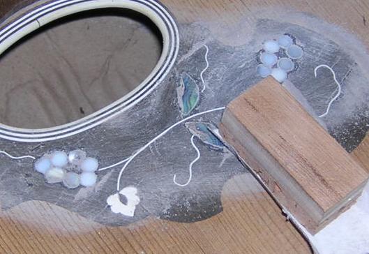 | The whole area was then flattened under light pressure, to ensure the levelness of the inserted MOP and abalone pieces. | Once the paste is dry, I use a small sanding block to sand level, using progressively finer paper. |