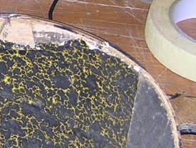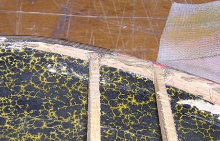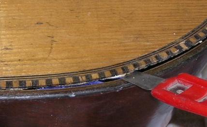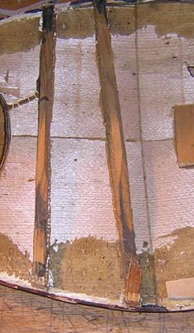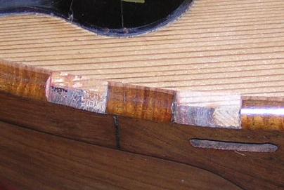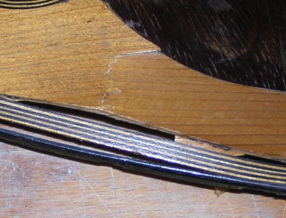 This is a view of the underside of the top. In this drastic example, the struts remained in place, while the purfling, and the top shrank inwards away from the edges leaving a very visible gap. |