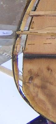 | On this instrument, there are no linings around the sides at this point, and shrinkage has forced the top and the edging apart where the top is thinnest, under the purfling. | Here it is possible to see that the strut top is not level with the lining top at all. This must have supported the top very badly. | |