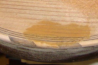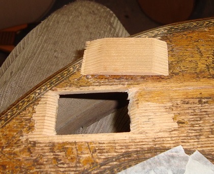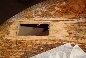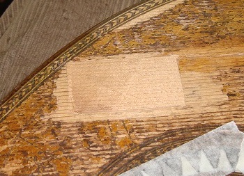 Large Holes In this section, I am defining a hole as a perforation in the top, but which does not have significant length like a crack. As such, it usually has a different cause..... sadly instrument abuse. The approach to repairing large holes is a little more complex and difficult than that for small holes and cracks. Essentially you need to cut around the hole to get good, clean edges, to which you can glue a replacement piece. |