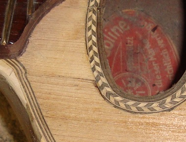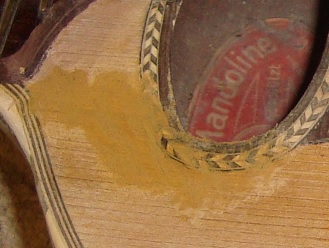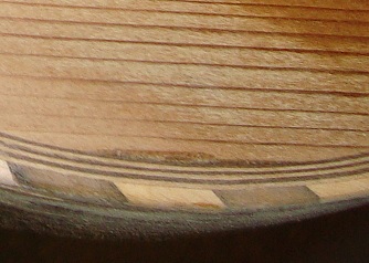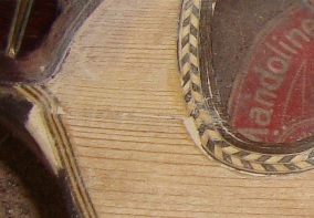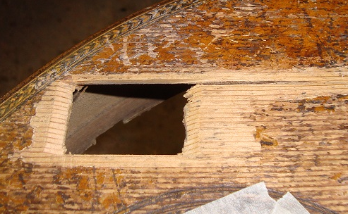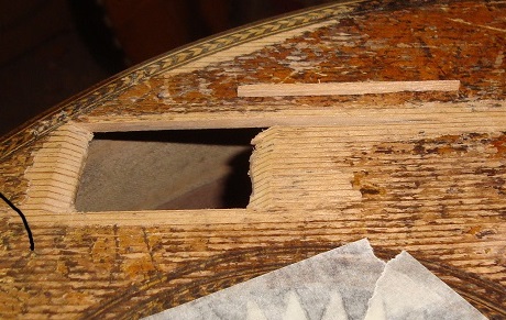 Left the hole is visible at the edge of the sound-hole purfling. Another is visible right in the second photo.... these holes are the result of shrinkage, and very tricky to fill with slivers of wood because of their shape... but the same process is applicable for holes that are the result of abuse... | ![]() |