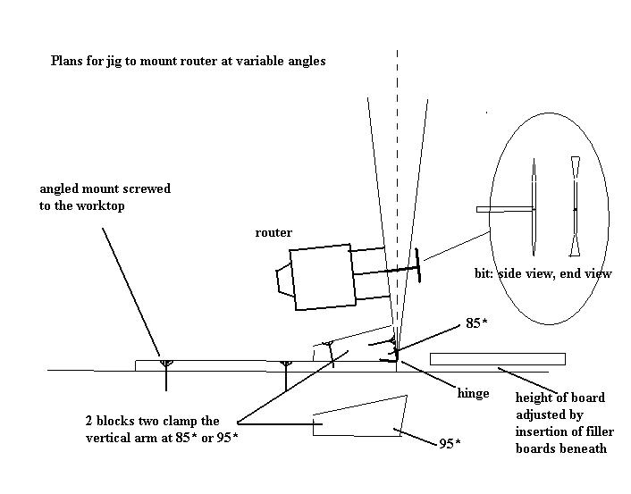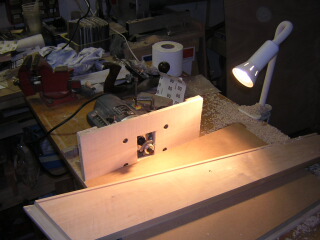 This proved quite a problem, because according to the plans, the slots had to be angled to 5* in at the front and 5* back in the back. The sides are not square relative to the front or back! Eventually, after several abhortive dry-runs, I came up with an adjustable router fence, that would angle backwards and forwards, and a bit that would do the job. (Not the first I tried...! I couldn't believe, none of the router bits I found on the internet had cut sizes indicated.) The top needed to be routed in the same way, to accomodate the top of the back and front panels.