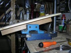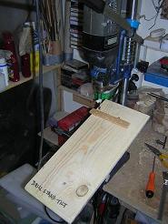 | 1. The first thing I made was the frame, end and two sides, but to do this I needed to work out a way of cutting the tightly mitred top end. The | 5. With the body complete, the next issue was drilling the holes. The side holes for the hitch pins was simple with a drill press, but mine does not have a tilting bed, so I was forced to make a simple one to allow me to tilt the body securely whilst drilling angled holes for the tuning pins. | ||