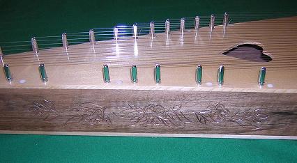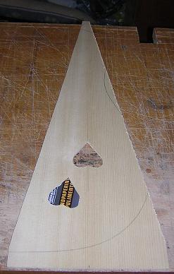 | 3. The next issue was with the top. Most guitar tops are less than 20" long, and as the psaltery was going to be 23", I came up a bit short of length in the tone wood. The solution could only be snall additions at either end to make up the length, but they certainly don't look out of place or even notice much. |