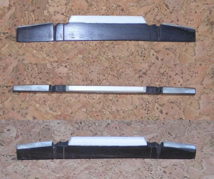 This is a hand-made replacement bridge in ebony or rosewood and bone, to fit old bowlback Neapolitan mandolins, and is based on an existing bridge on a Silvestri bowlback. It is 120mm long, 15-20mm tall before fitting, and 5mm wide, tapering to 3-4mm at the top. The bone saddle is approximately 50-55mm long. It will suit required bridge heights of 8-15mm. It will need to be fitted, but comes with a slightly curved foot, to begin fitting to the domed Neapolitan top. String slots can be cut if requested, but I will need to know required spread of strings. |