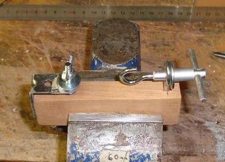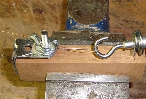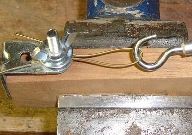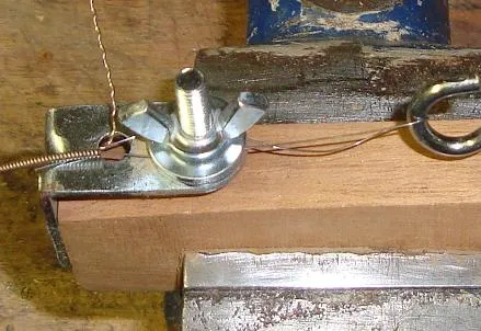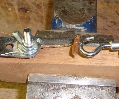 | 1. Clamp the string wider wooden block in a vice, and bend over the end of the string where you want the loop to be. | 2. Hook the loop around the hook, and clamp the two string ends into the butterfly vice. |