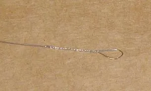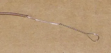 9. With wound strings above about .045, or where I have a small string hook, I usually strip off the winding before I try winding a loop. Work out how much you need to strip back to go round the hook and through the vice, and grip the string there. Using a pair of pliers, tease off some of the winding at the end of the string, grip the end firmly with the pliers, and PULL. With luck it will unwind it self under pressure back to where you are holding it. Snip off the winding. |